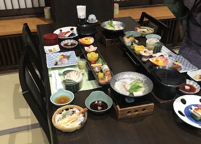 En nuestra reserva teníamos incluida la cena y el desayuno, así que cuando llego la hora nos dirigimos al comedor, también vestidos con la Yukata (ya que por todo el hotel los huéspedes tenían que llevarlo puesto), nada más llegar nos indicaron nuestra mesa en la cual ya había una gran cantidad de comida también tradicional, después de cenar volvimos subir a la habitación, esta vez para estrenar nuestro pequeño onsen privado de piedra, y para dormir en los futones (camas tradicionales).