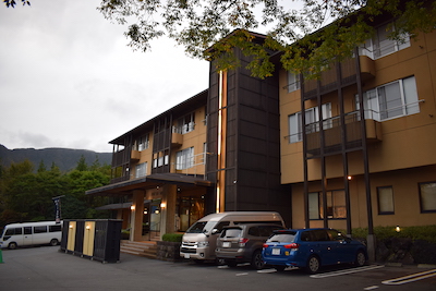 Una vez en Gora, quedaba todavía un autobús más por coger, y como la línea que queríamos coger nosotros también estaba afectada por el Tifón, tuvimos que coger otra línea que por suerte también nos dejaba en la puerta del Hotel, así que, sin problema, esperemos su llegada y ¡por fin lleguemos!, hay que decir que mucho camino para llegar a un hotel, pero la verdad mereció la pena muchísimo, elegimos este Ryokan en concreto ya que lo teníamos recomendado, y cumplió todas nuestras expectativas.